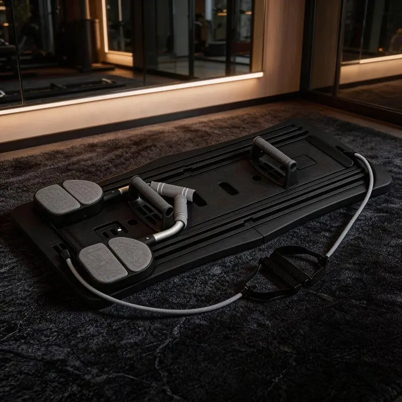 Les exercices de gainage et de pompes au sol sont efficaces — mais sans support adapté, les coudes et les poignets prennent tout l'impact. La planche Pilates structure le mouvement avec des appuis rembourrés, une résistance intégrée et un format pliable qui se range sous un lit. Une séance complète dans l'espace d'un tapis, sans équipement encombrant.